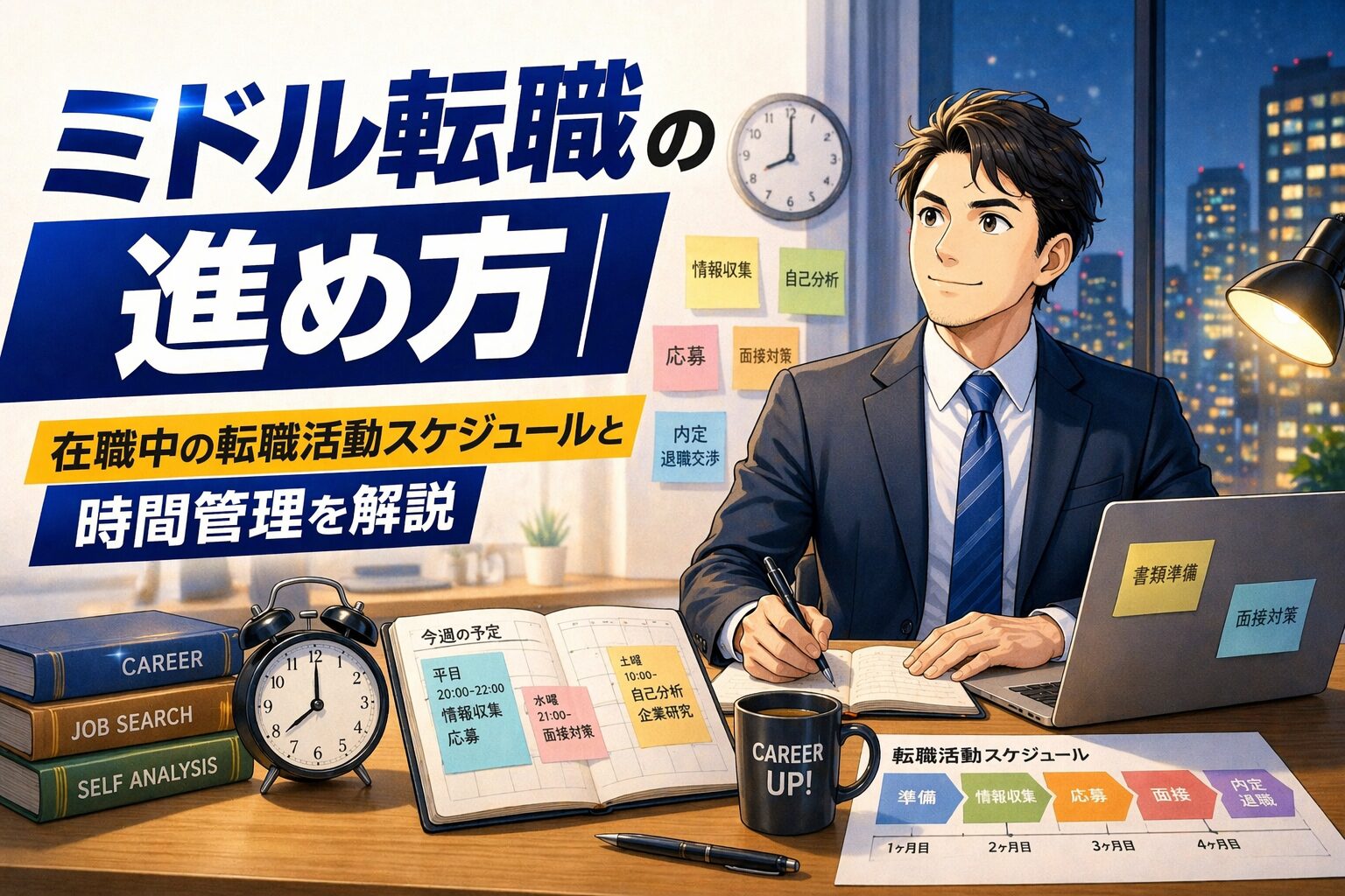 この記事では、在職中のミドル転職を前提に、活動スケジュールの全体像と時間管理のコツを具体的に解説します。